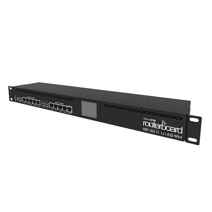 RB3011UiAS-RM Unit comes with 1U rackmount enclosure, a touchscreen LCD panel, a serial console port and PoE output functionality on the last Ethernet port.