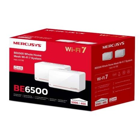 Mercusys Halo H37BE (2-PACK) BE6500 Whole Home Mesh Wi-Fi 7 System, 688 Mbps at 2.4 GHz + 5760 Mbps at 5 GHz, Internal Antennas, 2x 2.5 Gbps Port (WAN/LAN auto-sensing), 1x Gigabit Port (WAN/LAN auto-sensing), MLO, 4096-QAM, OFDMA, EHT160 on 5GHz