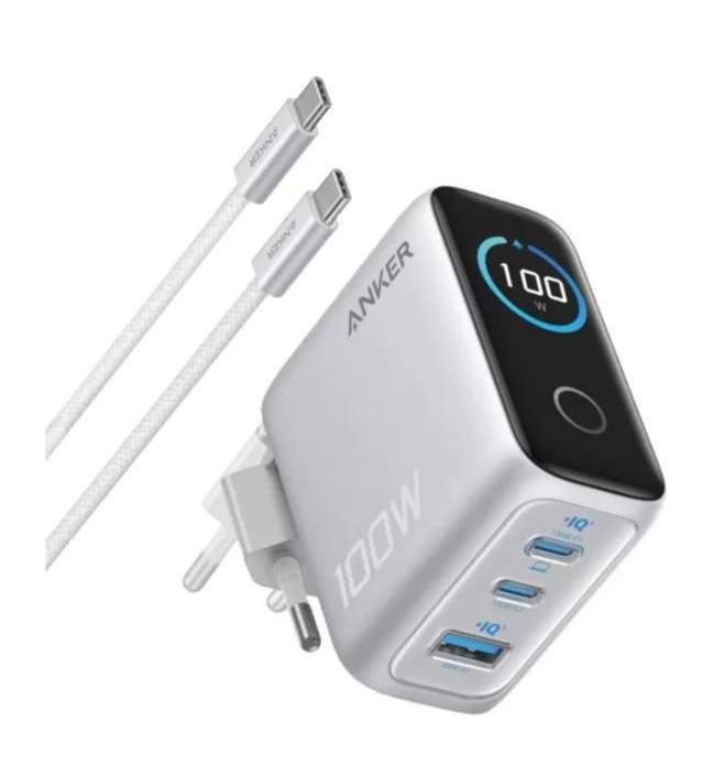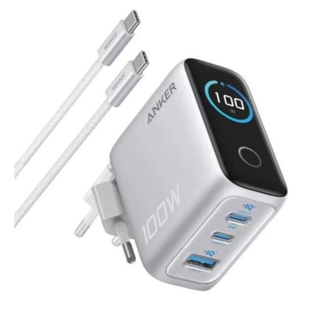 Anker Charger (100W, 3 Ports, Smart Display) Silver